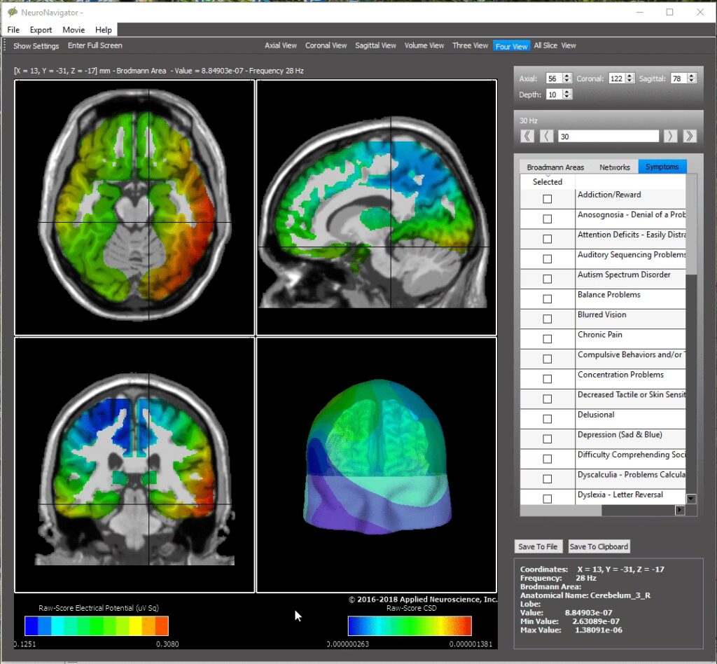 En los trastornos de salud mental y neurológicos, los patrones de ondas cerebrales pueden volverse desregulados. Esta desregulación puede manifestarse como un exceso o una deficiencia de ciertos tipos de ondas en áreas específicas del cerebro, lo que lleva a una actividad biológica y un comportamiento poco saludables. Por ejemplo, las personas con trastornos de ansiedad a menudo presentan un exceso de actividad de ondas beta rápidas, lo que puede dejarlas sintiéndose constantemente al límite, hiperactivas y propensas a los ataques de pánico. En contraste, aquellos con TDAH pueden tener un exceso de actividad de ondas theta más lentas en ciertas áreas, lo que contribuye a síntomas como "niebla mental", dificultad para mantener la atención y tendencia a soñar despierto.