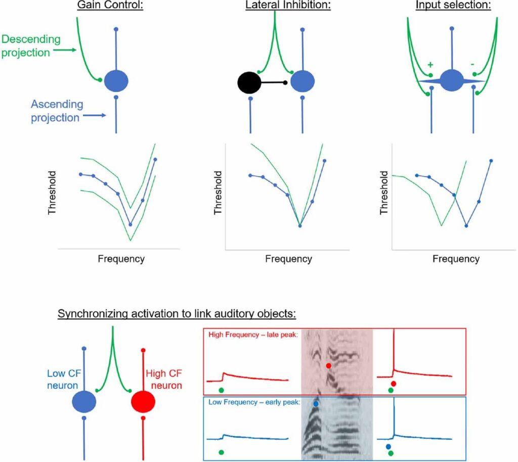 Un aspecto particularmente interesante de las proyecciones descendentes es la distinción funcional entre las neuronas corticotalámicas de la Capa V y la Capa VI. Las neuronas de la Capa V suelen ser piramidales grandes con dendritas apicales gruesas y a menudo muestran "descarga intrínseca en ráfagas" en respuesta a estímulos. Se consideran "impulsoras" (drivers), transmitiendo señales robustas y fiables a sus objetivos subcorticales. Por otro lado, las neuronas corticotalámicas de la Capa VI son más pequeñas, con dendritas apicales más cortas y delgadas, y generalmente presentan "descarga regular". Se les considera "moduladoras", integrando información localmente y ajustando la excitabilidad de sus objetivos subcorticales. Esta diferencia en sus propiedades eléctricas intrínsecas y en los patrones de entrada que reciben sugiere que las proyecciones corticotalámicas de la Capa V y VI desempeñan roles distintos en el procesamiento de la información, influyendo en cómo el tálamo y otras estructuras responden a las señales auditivas.