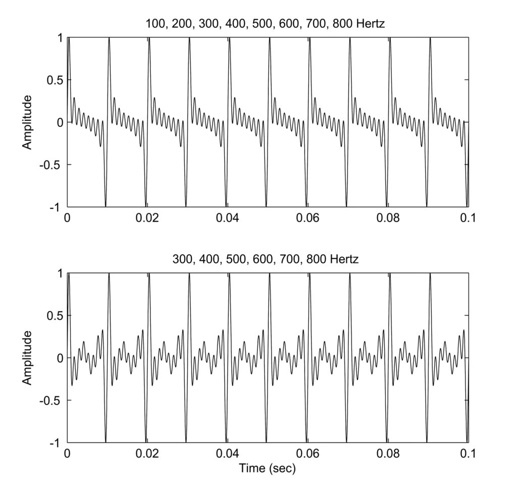 Para entenderlo, debemos hablar de los tonos complejos y los armónicos. La mayoría de los sonidos que escuchamos, especialmente en la música o el habla, no son tonos puros (una sola frecuencia), sino combinaciones de múltiples frecuencias. Cuando se produce un sonido con una frecuencia fundamental (llamémosla f), también suelen generarse frecuencias que son múltiplos enteros de esa fundamental: 2f, 3f, 4f, 5f, etc. Estas frecuencias múltiplos se llaman armónicos. La intensidad relativa de estos armónicos es lo que le da a cada instrumento o voz su timbre único.