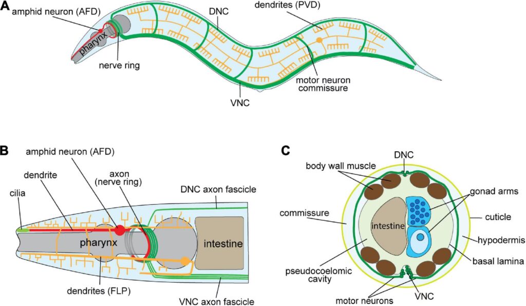 El sistema nervioso de C. elegans es mucho más simple (302 neuronas con conexiones conocidas) que el de los humanos. Sin embargo, muchos de los componentes moleculares y funcionales básicos de la transmisión sináptica y el desarrollo neuronal están conservados. Esto permite estudiar principios fundamentales de la función neuronal y modelar aspectos de enfermedades neurodegenerativas a nivel molecular y celular, aunque no la complejidad total del cerebro humano.