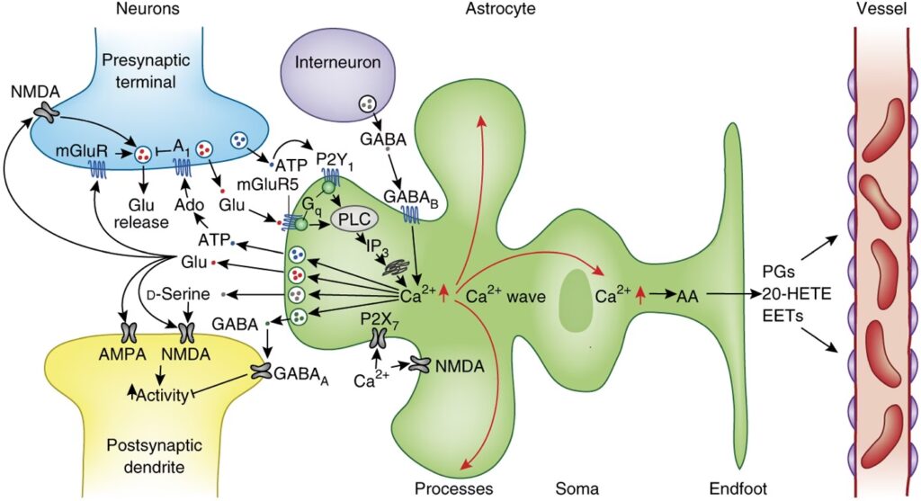 La activación de sinapsis excitatorias, la unión de glutamato a receptores metabotrópicos activando receptores de IP3, y la liberación de calcio inducida por calcio (CICR) a través de receptores de rianodina o IP3 desde depósitos intracelulares pueden causar liberación de calcio en las neuronas.