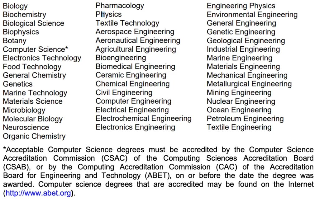| Educación Requerida | Grado técnico/científico elegible | Grado técnico/científico elegible + Título de Abogado (JD) |