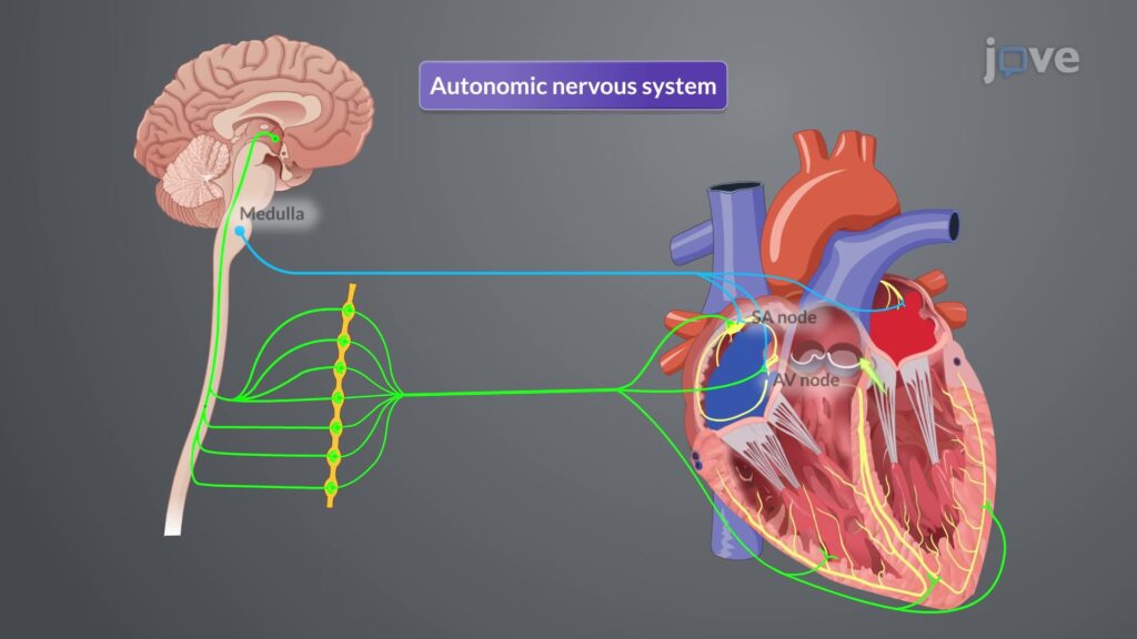 El cerebro, a través de la Red Autonómica Central (CAN) y sus conexiones con las neuronas preganglionares simpáticas (en la médula espinal) y parasimpáticas (en el bulbo raquídeo), ajusta el equilibrio entre la actividad simpática y parasimpática que llega al corazón, modificando así su frecuencia, fuerza y ritmo.