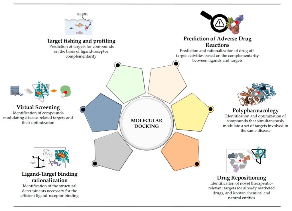 - Cribado virtual: Explorar computacionalmente grandes bibliotecas de compuestos para identificar aquellos con mayor probabilidad de unirse a la diana.