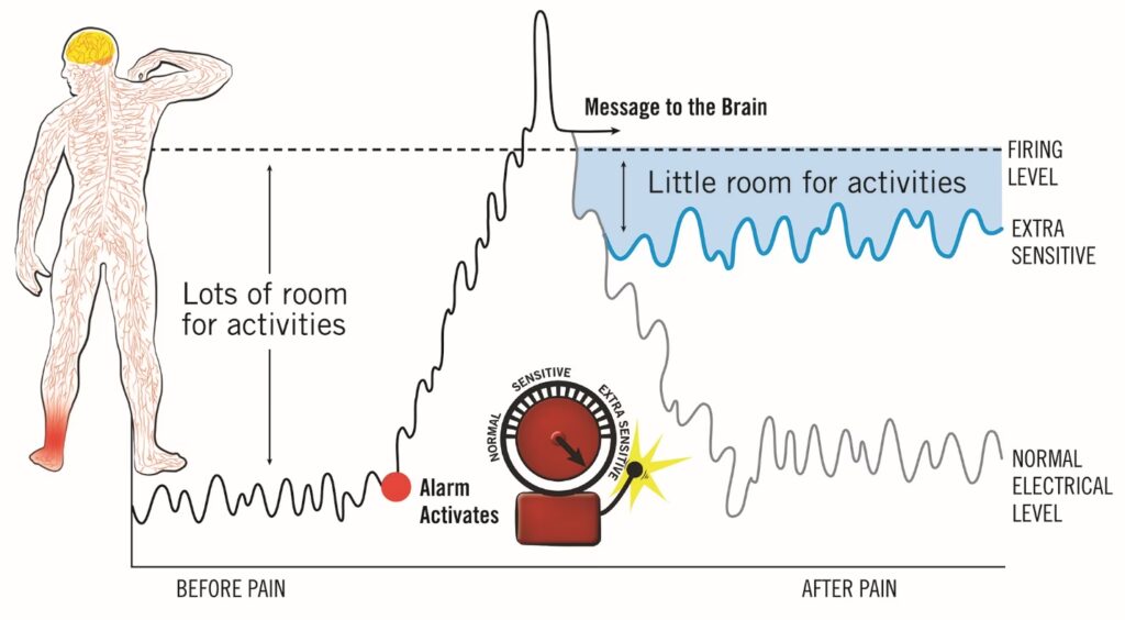 Durante mucho tiempo, el dolor crónico fue visto principalmente como una consecuencia directa de una lesión o enfermedad periférica. Si bien a menudo se origina en el sistema nervioso periférico, la evidencia actual demuestra que, con el tiempo, el dolor crónico se “centraliza”. Esto significa que el propio sistema nervioso central, incluyendo la médula espinal y el cerebro, experimenta adaptaciones maladaptativas que perpetúan la sensación de dolor, incluso si la causa original ha desaparecido o disminuido. Es un proceso de aprendizaje maladaptativo donde el cerebro, en lugar de “olvidar” el dolor una vez resuelta la lesión, se vuelve hipersensible y continúa generando señales de dolor.