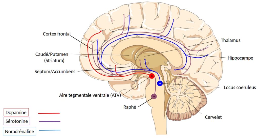 - GABA: Implicado en la regulación inhibitoria, equilibrando las señales excitatorias en el circuito para un procesamiento adecuado de la recompensa.