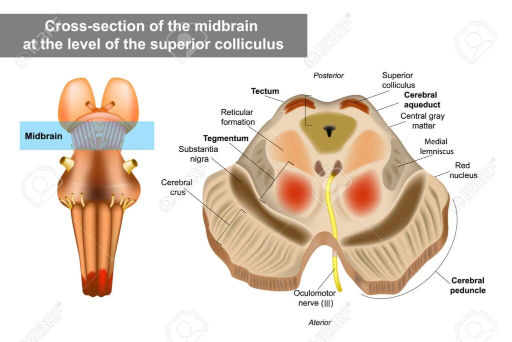 - Neuroimagen: La resonancia magnética (RM) es la técnica de imagen más útil para visualizar las estructuras del mesencéfalo y detectar lesiones como infartos, hemorragias, tumores o cambios degenerativos (ej. atrofia de la sustancia negra). La tomografía computarizada (TC) puede ser útil en casos agudos (ej. hemorragia) o para evaluar fracturas.