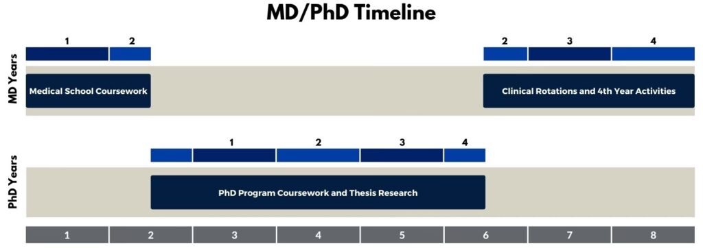 Un programa MD-PhD es un curso de estudio integrado que generalmente dura entre 7 y 8 años. Los primeros dos años suelen centrarse en el plan de estudios preclínico de la escuela de medicina, seguido de 3 a 4 años dedicados a la investigación doctoral, culminando con la defensa de una tesis. Los últimos años se completan con las rotaciones clínicas restantes de la escuela de medicina. La mayoría de estos programas, especialmente aquellos financiados por el Instituto Nacional de Ciencias Médicas Generales (NIGMS) a través de subvenciones MSTP (Medical Scientist Training Program), ofrecen exención de matrícula y un estipendio para cubrir los gastos básicos durante todos los años del programa. Esta financiación es un gran atractivo, pero también aumenta la competitividad por las plazas.
