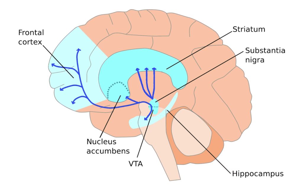 La vía de recompensa —o vía mesolímbica— comienza en la parte media de tu cerebro y se extiende hasta la corteza cerebral. La liberación y utilización de dopamina se llevan a cabo en varias regiones del cerebro: