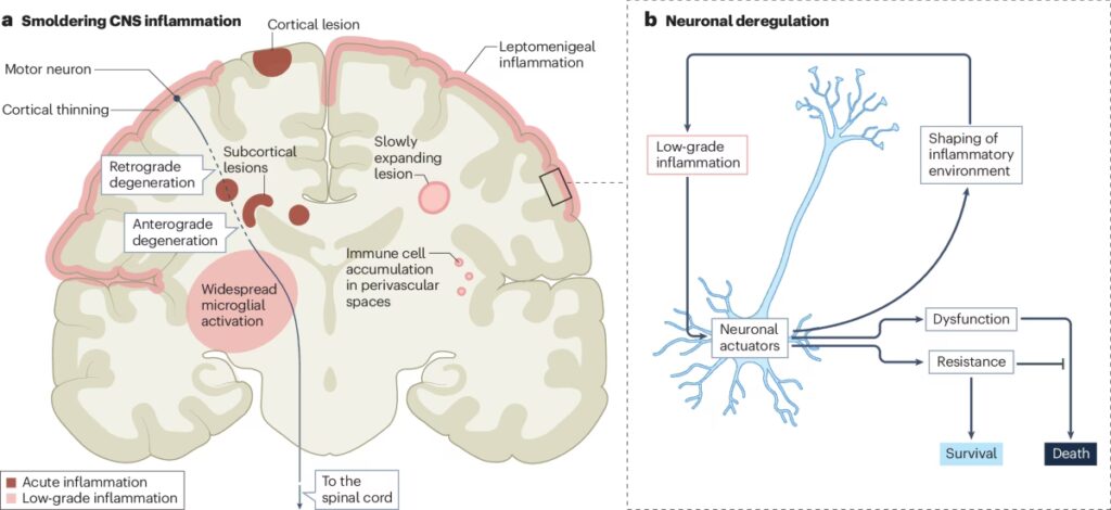 La atrofia cerebral en la EM se debe a la pérdida acelerada de células nerviosas y la destrucción de axones y mielina causada por la inflamación autoinmune característica de la enfermedad. Algunas áreas cerebrales dañadas por las lesiones pueden experimentar una degeneración más rápida con el tiempo.