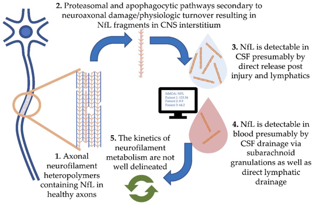 Aunque el mecanismo exacto por el cual el NfL se libera de las neuronas dañadas no se comprende completamente, lo más probable es que sea una consecuencia directa de la pérdida de integridad de la membrana celular. Estudios de expresión génica no respaldan la idea de que el aumento del NfL en enfermedades neurológicas se deba a una sobreproducción compensatoria.