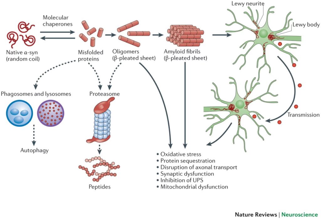 La proteína alfa-sinucleína juega un papel fundamental en la patología de la EP. En un cerebro sano, la alfa-sinucleína existe principalmente como una proteína desplegada o en formas tetraméricas solubles. Sin embargo, en la EP, adopta una estructura rica en hojas beta, propensa a la agregación. Estas formas mal plegadas se acumulan, inicialmente en oligómeros solubles (que se consideran altamente neurotóxicos) y posteriormente en fibrillas insolubles que forman el núcleo de los cuerpos de Lewy.