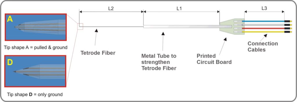 Aunque el concepto se puede aplicar a cualquier número 'n' de electrodos cercanos (n-trode), cuatro (tetrode) es una configuración que se ha demostrado muy efectiva. Permite triangular la posición aproximada de la neurona respecto a las puntas y proporciona suficientes puntos de referencia para diferenciar patrones de amplitud de distintas neuronas cercanas.