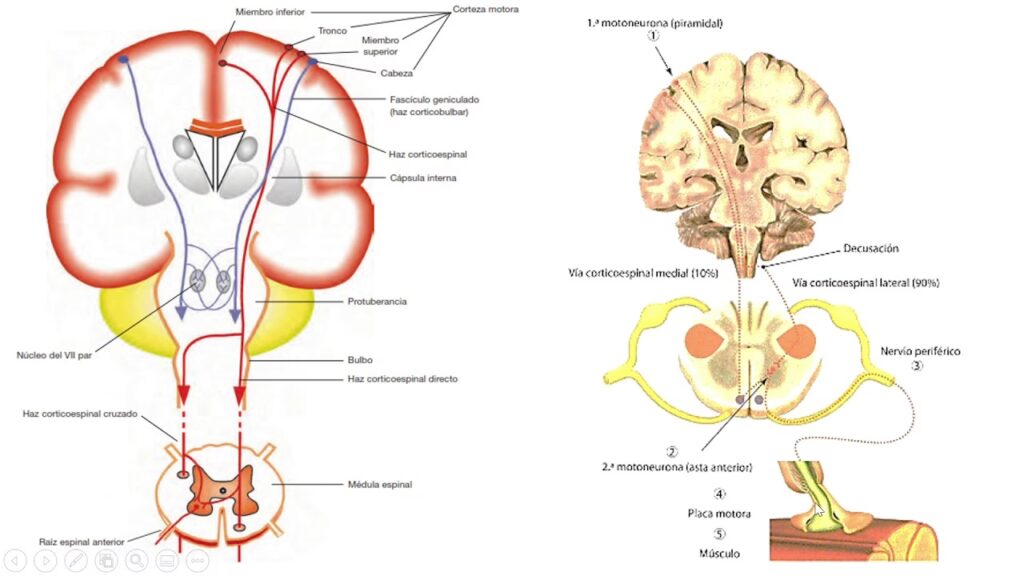 • Neurona Motora Superior (NMS): Son las neuronas que se originan en la corteza cerebral o en los núcleos del tronco encefálico. Sus axones descienden por las vías motoras hasta hacer sinapsis en el sistema nervioso central inferior (médula espinal o núcleos de pares craneales en el tronco encefálico). Una lesión en la NMS generalmente provoca debilidad muscular, aumento del tono muscular (espasticidad) y reflejos exagerados.